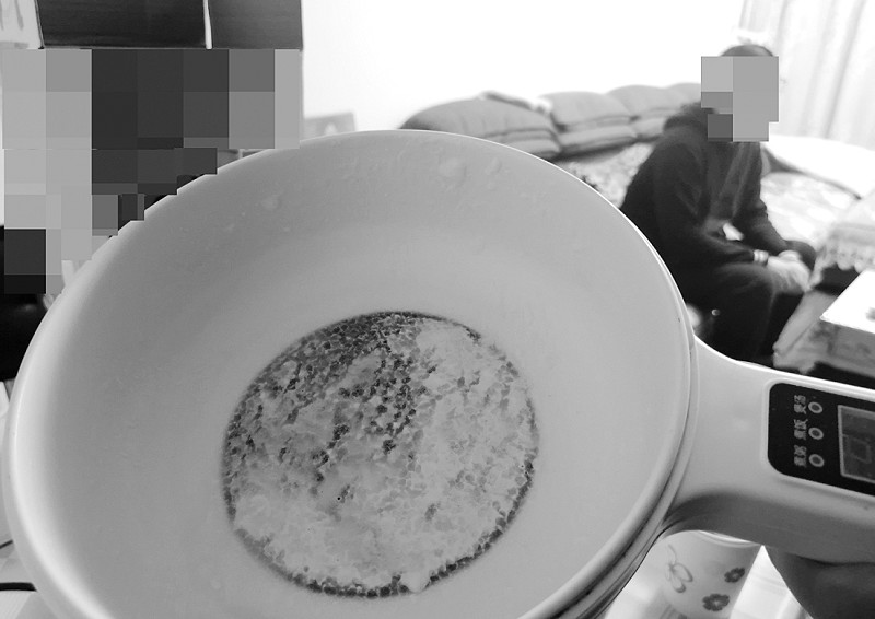1月6日晚上,记者来到徐女士家中进行现场实验。记者先从已开箱的第一箱牛奶中拿出一盒未开封牛奶,观察其包装密封,未出现泄漏或鼓胀等现象。记者打开这盒牛奶,观其色、尝其味,未发觉异常,倒入锅中加热后,锅底确实出现了一层白色絮状物。记者随即打开第二箱牛奶,重复以上操作,未加热前同样未发觉异常,加热后牛奶也出现了白色絮状物。