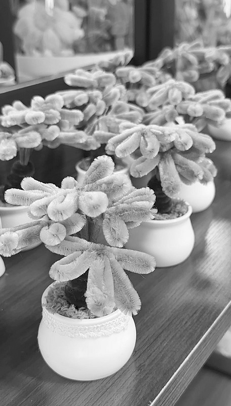 在工坊的一角,几个透明的圆桶里装满了做坏的花瓣。“这都是他们练习时做坏的,我都积攒起来。”程玉珠拿起一瓣有些松散的花瓣说,“心青年”从第一次接触扭扭棒,到做出合格的花瓣,至少需要3个月。从把一根扭扭棒剪成相同长短的短棒,到把控力道,缠绕出松紧适度的花瓣,每一步都凝聚着无数次的练习。