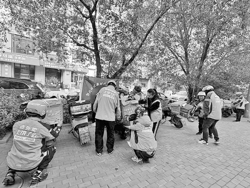 社区工作人员倡导小哥们遵守公共秩序、爱护公共环境、关心街区邻里、弘扬文明新风,安全出行守规矩,热情友善讲礼貌,争做文明践行者、新风传播者、城市宣传者。