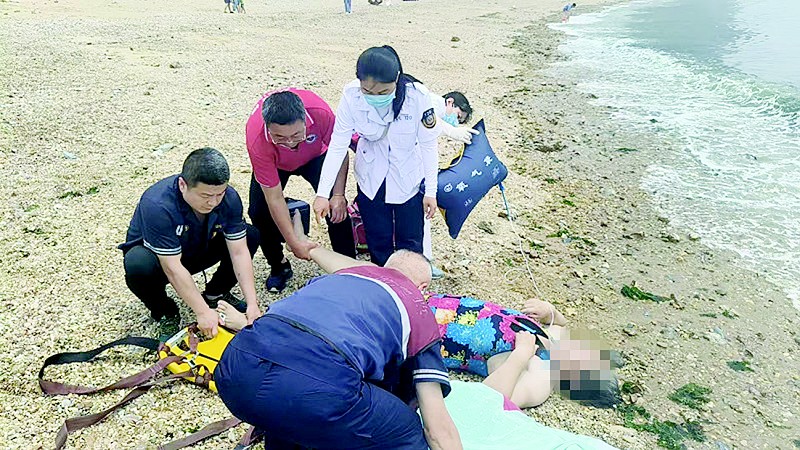 7月1日上午,一名女性游客在星海湾浴场溺水,不远处的大连万众应急救援队星海湾救援站3名值班队员闻讯赶到,将溺水者抬到岸上并进行急救,女子被救护车送往医院时尚有生命体征。