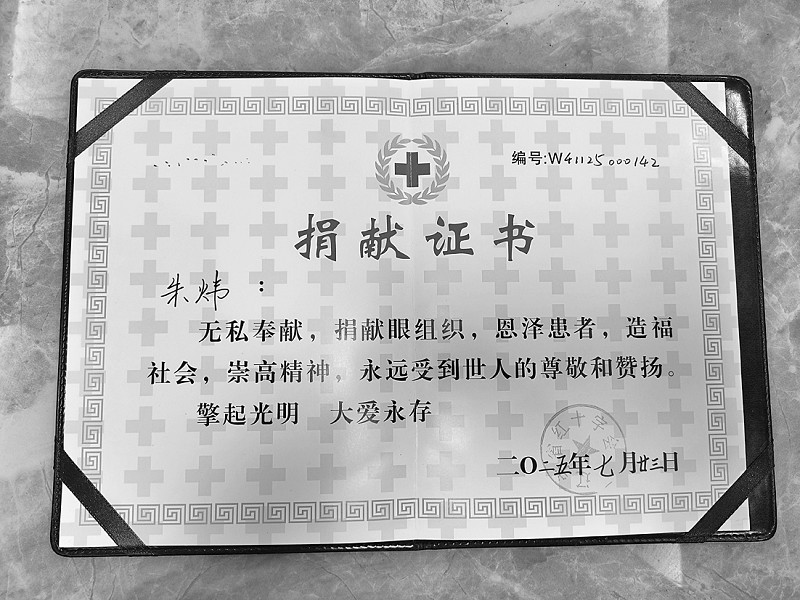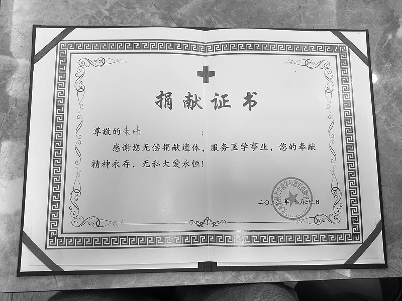 朱炜离世后,他的女儿和母亲共同完成了他的遗愿:完成遗体捐献。7月23日傍晚,在朱炜生前租住的房子里,记者见到了他的女儿,她不停抹着眼泪,小心翼翼地捧出两本证书。一本是辽宁红十字会的捐献证书,另一本是大连医科大学遗体和器官捐赠中心的证书。朱炜的女儿说,朱炜的眼角膜已被相关单位接收,将帮助他人重见光明;他的遗体将用于医学研究。“根据流程,不仅需要家属的签字,还需核实捐献者本人的意愿。”朱炜母亲表示,朱炜生前就决定进行遗体捐献,曾计划向有关单位申请,但因其行动不便,未能及时完成申请便离世了。后来,医院经过向社区书记等知情人核实,才办理完成捐献手续。