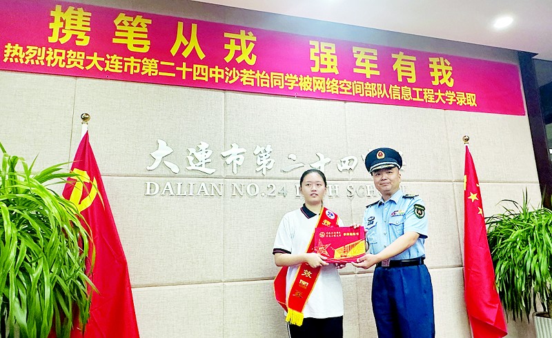 在二十四中的仪式现场,强军战歌激昂回荡,鲜花与掌声簇拥着以656分优异成绩考入网络空间部队信息工程大学遥感科学与技术专业的沙若怡。从大连市政府征兵办副主任张培宇手中郑重接过通知书后,这位即将成为军校学员的女孩庄严承诺:“从这里出发,去祖国需要的地方。”她说,二十四中浓厚的红色基因——从五爱碑的传承到学长穿军装的榜样——早已在心中埋下报国种子。她选择将个人理想融入国防事业,誓言“以科技强军为目标,成为适应未来战场的新型军事军官”。