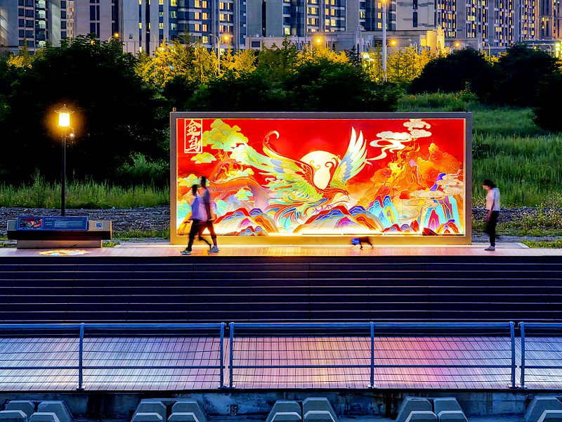 “山海经文化休闲栈道”位于东港旅游度假区东部地块,建设长度约1200米,栈道融入了《山海经》文化元素。栈道全程设计了7处大型立体绘本艺术装置,呈现九尾狐、金乌等山海经灵兽与共工触山、女娲补天等神话传说,通过先进的光影技术和精巧的剪纸艺术,让《山海经》中的神兽与故事“活”了起来,成为拍照打卡、亲子共游、感受中华文化魅力的绝佳去处。同时,文化栈道沿线将设置多处“青丘驿站”,为前来参观的游客市民提供亲海、休闲、品美食与文化体验等空间。