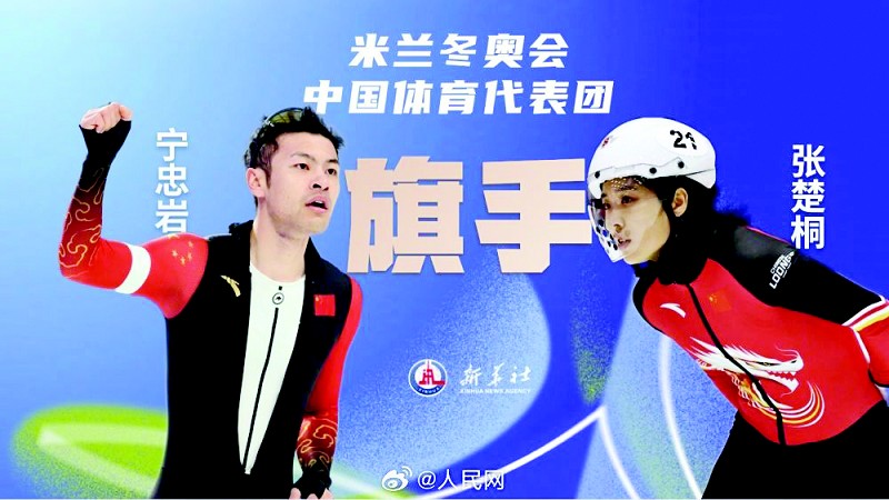 米兰冬奥会中国体育代表团宣布,在6日举行的冬奥会开幕式上,中国代表团旗手将由速度滑冰男子运动员宁忠岩和短道速滑女子运动员张楚桐担任。