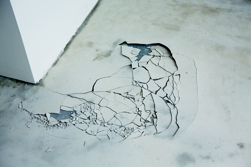 3月8日,记者在董先生的陪同下来到事发地点现场探访。进入房屋,记者看到大片地板被撬起堆放在地上,天花板上也出现大片水渍痕迹。来到三层卫生间,董先生打开水阀,记者看到,在坐便器后侧下方,一处连接着水管的黑色塑料材质部件出现了裂隙,不断向外喷水,水流量较大。