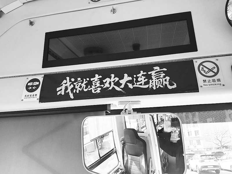 经过走心改造,李涛驾驶的4路公交车内贴着“海边出生,海里成长”的《大海啊故乡》歌词;球队赛场照拼成的展板上还有球迷们熟悉的歌词,字里行间都是为家乡球队加油的热乎劲。“去年拉球迷去赛场,听见他们唱‘大海是我的故乡’,又喊着‘大连加油’,那股子劲儿太感染人了!”李涛说,过去对足球不太感兴趣的他,如今不仅能跟着哼球迷歌,更琢磨着把大连元素全“塞”进车厢,“你看这歌词、这球队徽章,都是想告诉大家:我们大连人爱足球,更爱这片海、这座城!”他说,经常有乘客对着车厢内的装饰拍照,就觉得做这些值了,“咱普通司机没别的本事,就想让这车厢变成大连的‘移动名片’。”