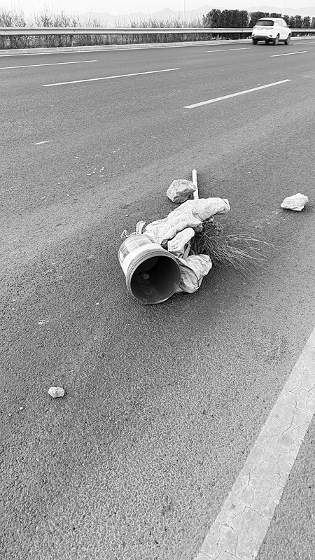 张女士表示,撞到障碍物后,她发现障碍物是用石头压住了一个蓝色塑料桶,桶身用灰白色的塑料布裹着,一根扫帚直直立在桶中,明显是人为放置的。“不知道放置这个东西的目的是什么,如果蓝色桶身没有被灰白色塑料布裹住的话,可能司机还能提早发现、提早避让。”张女士检查发现,车辆的前保险杠出现刮痕,车牌发生翘曲。