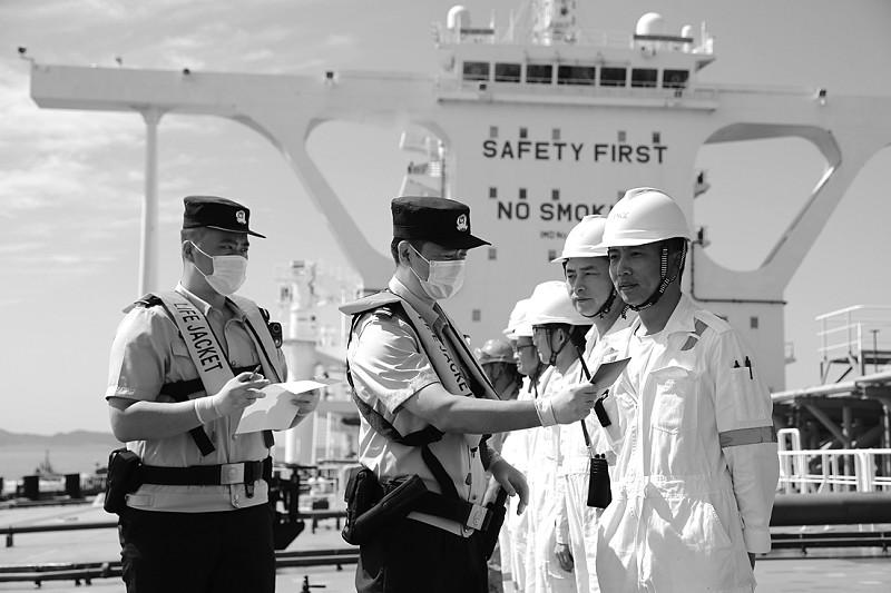 大连港油品码头是国内最大的原油码头之一,大型油轮船舶是这里的“常客”。9月13日,30万吨级原油船凯恒/NEW CONSTANT轮停靠在新港22区泊位进行卸货作业。当天,大连出入境边防检查站综合执勤七队的移民管理警察登船进行在岗抽查。