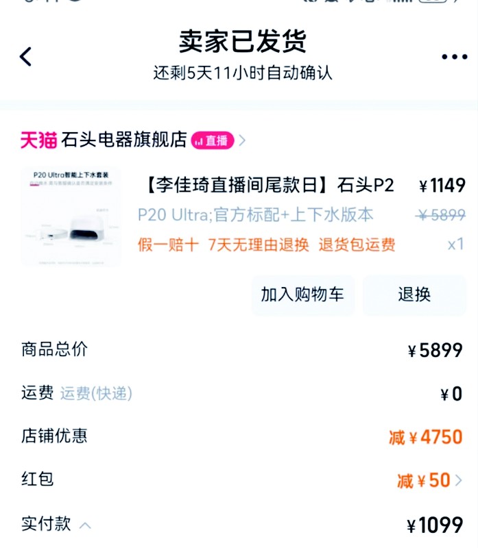5月16日晚,消费者王女士在天猫平台搜索石头科技扫地机时,发现一家名为“石头电器旗舰店”的店铺正在销售P20Ultra型号产品。该商品页面醒目标注着“李佳琦直播间尾款日”字样,原价显示为5899元,经过多重优惠后实际仅需支付1099元。这个价格让王女士感到十分意外,因为她一个月前刚在“石头生活电器旗舰店”以3909.15元的价格购买过同款产品(原价5099元)。