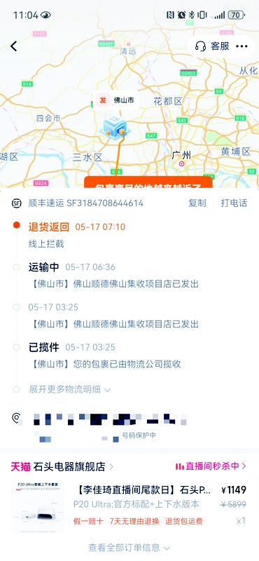 然而次日清晨,王女士发现订单状态显示为“线上拦截-退货返回”。物流信息显示:17日凌晨完成揽收并开始运输,但在17日7时10分被商家单方面拦截。