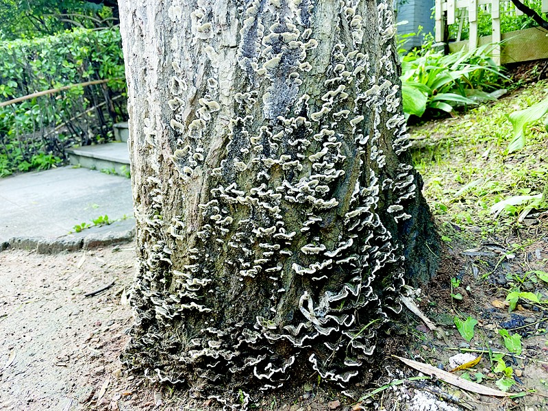 关于云芝的生长特性,专家指出:“云芝通常以朽木为培养基,活体树木上长出云芝,往往意味着树木本身存在健康问题。可能是树皮发生了损伤、出现局部坏死,或内部已经开始腐朽,这些病变部位为云芝的菌丝体提供了侵入和生长的空间。”