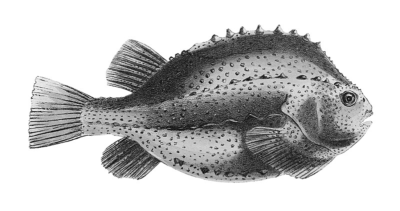 海参斑是鲉形目圆鳍鱼科圆鳍鱼属中唯一一种鱼类。在西方,俗称为隆头鱼或圆鳍鱼。据了解,因为其布满小突起的背鳍嵌入厚实的背部皮肤后,呈现出的隆起外观,好像扩大后的头部,因此得名隆头鱼。邢坤调研了解到,海参斑属于鲉形目,和海参没有半毛钱关系,和属于鲈形目的石斑鱼也扯不上亲戚。海参斑和大连很常见的黑鱼——许氏平鲉属于一个目,就连黑色的外表也有点神似,但是除此之外,好像再没有一点相似之处了。