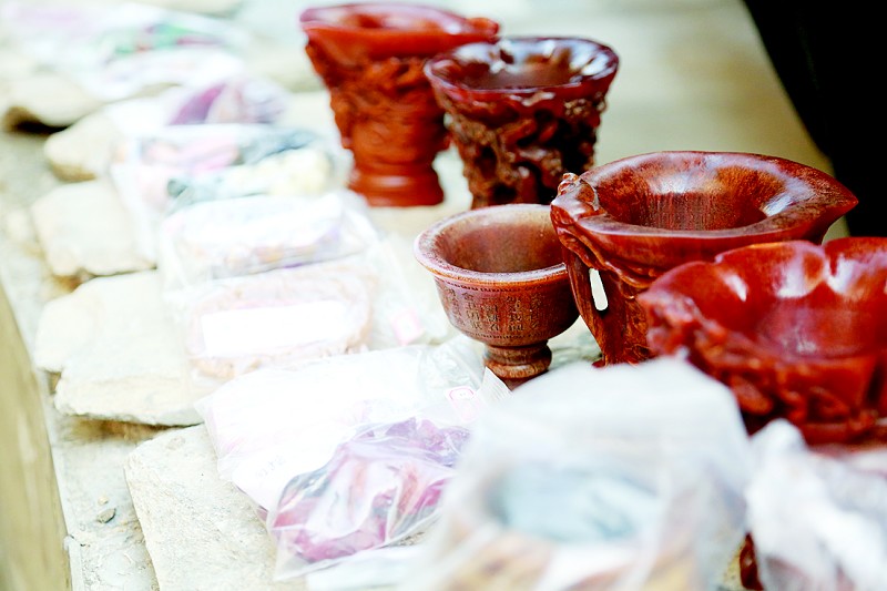 ●购入“披毛犀”系列商品,种类涵盖摆件、角、碗、杯等,一款名为“黑金披毛勺子”的商品,购自“吉泰珠宝官方旗舰店”,重8克,标注“小孩发烧时用此勺连续喝水,30分钟内可退烧”,而售价仅为9.9元。