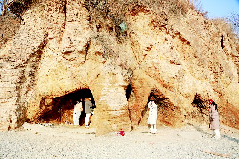 从岩性组成来看,大连南部海岸以板岩、石英岩等为主,这类岩石结构致密,抗侵蚀能力较强,因此能在长期海水作用下形成轮廓清晰、形态规整的海蚀洞。岩体表面呈现的褐黄色调,并非岩石原色,而是表面铁质矿物经长期风化氧化形成的“假色”,属于风化壳的常见特征。至于岩石局部视觉上呈现的青黑色,张戈教授表示,石英岩本身为半透明至透明,当周围光线被岩体遮挡、仅从断面或薄层处观察时,会产生类似厚玻璃断面的青灰色视感,属光学现象。