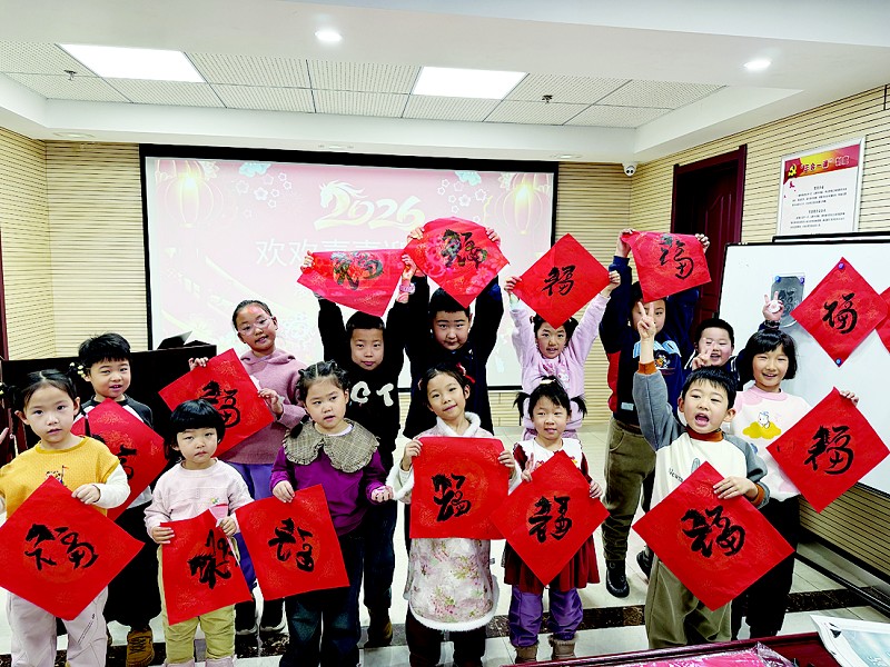 活动现场分为三大体验区。投壶游戏区,孩子们直观感受到传统礼仪的雅趣。创意制作区内,一双双小手正专注地绘制专属冰箱贴,一件件作品承载着他们对新年的期盼。在翰墨区,在书法志愿者老师的指导下,孩子们一笔一画认真地书写着“福”字和春联。