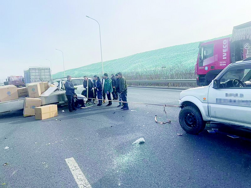 随着时间推移,更多热心司机陆续加入。有人帮忙捡拾货车上掉落的货物,还有人将货物搬至路面以警示后方车辆、防范二次事故;有人找来捆车带,尝试将两车分离。刘先生尝试用自己的吉姆尼越野车牵引货车,但因两车咬合过紧,首次拖拽未能成功。此时,一位厢式货车司机主动提议,直接拖拽SUV车,并在系好拖车绳后成功将两车分开。