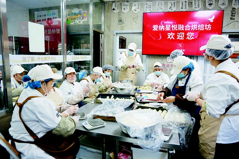 爱纳星悦融合烘焙坊成立于2021年,由21个“心”青年家庭合伙投资,对外还连接着450多个“心”青年。这些“心”青年是烘焙坊的主要员工,他们或在父母家长的陪同下,或在专业烘焙师、就业辅导员的辅助下,在生产流水线中发挥着自己的作用。