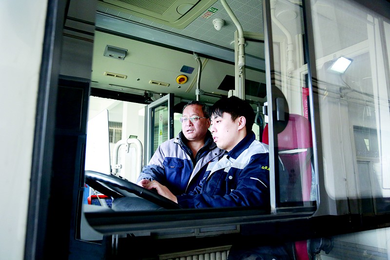 二保班长杨吉明今年42岁,工龄已有19年。他带领二级保养班组成员李书聪,在深1米、宽1米、长24米的地沟中对车辆底盘进行细致排查。他打了个比方:“检修公交车,有时候就像老中医看病,也要‘望闻问切’,有时光听声音就能判断出故障位置。”