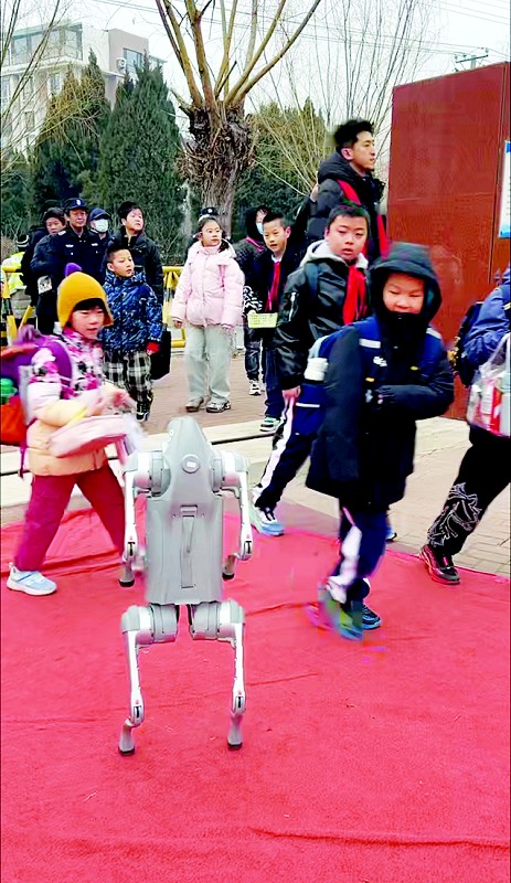 在甘井子区奥林小学,“萌宠”机器狗吸引了大批粉丝。“前两天刚看完春晚里的机器人,这机器狗就进校园了。科技飞速发展的时代,好好学习吧!”一位老人在校门口跟自家孙子、孙女边挥手边感慨。喜庆的音乐,欢快的锣鼓,在科技感的加持下,奥林小学以“阅读伴成长 书香满校园”为主题,为孩子们安排了一系列读书主题的打卡点和阅读存折等伴手礼。