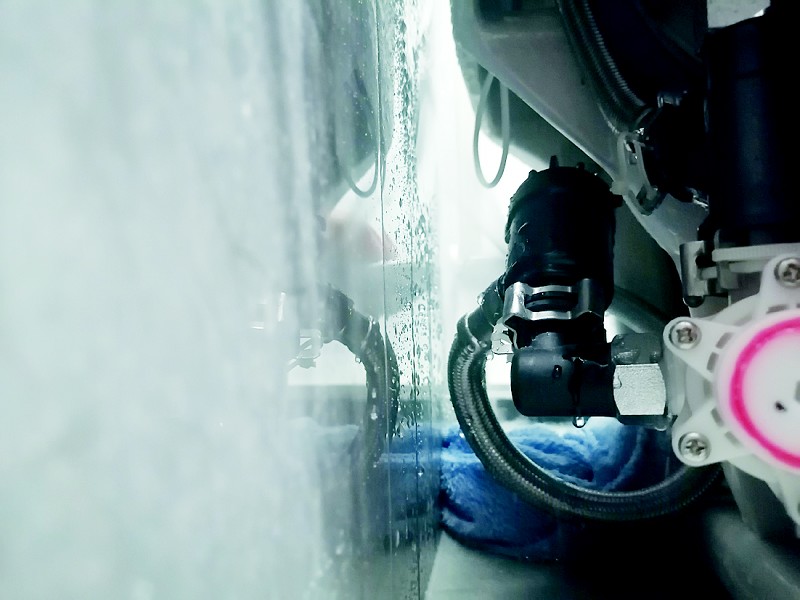 3月8日,记者在董先生的陪同下来到事发地点现场探访。进入房屋,记者看到大片地板被撬起堆放在地上,天花板上也出现大片水渍痕迹。来到三层卫生间,董先生打开水阀,记者看到,在坐便器后侧下方,一处连接着水管的黑色塑料材质部件出现了裂隙,不断向外喷水,水流量较大。