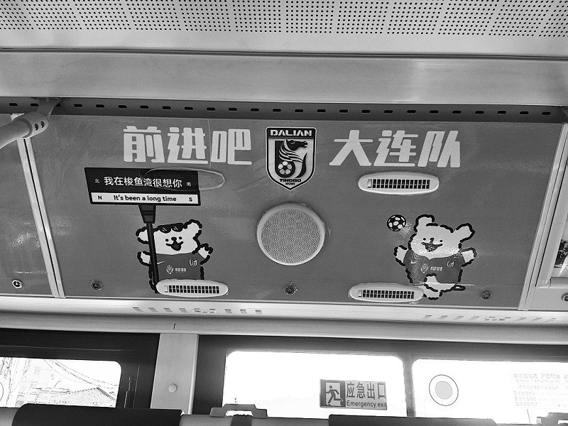 经过走心改造,李涛驾驶的4路公交车内贴着“海边出生,海里成长”的《大海啊故乡》歌词;球队赛场照拼成的展板上还有球迷们熟悉的歌词,字里行间都是为家乡球队加油的热乎劲。“去年拉球迷去赛场,听见他们唱‘大海是我的故乡’,又喊着‘大连加油’,那股子劲儿太感染人了!”李涛说,过去对足球不太感兴趣的他,如今不仅能跟着哼球迷歌,更琢磨着把大连元素全“塞”进车厢,“你看这歌词、这球队徽章,都是想告诉大家:我们大连人爱足球,更爱这片海、这座城!”他说,经常有乘客对着车厢内的装饰拍照,就觉得做这些值了,“咱普通司机没别的本事,就想让这车厢变成大连的‘移动名片’。”