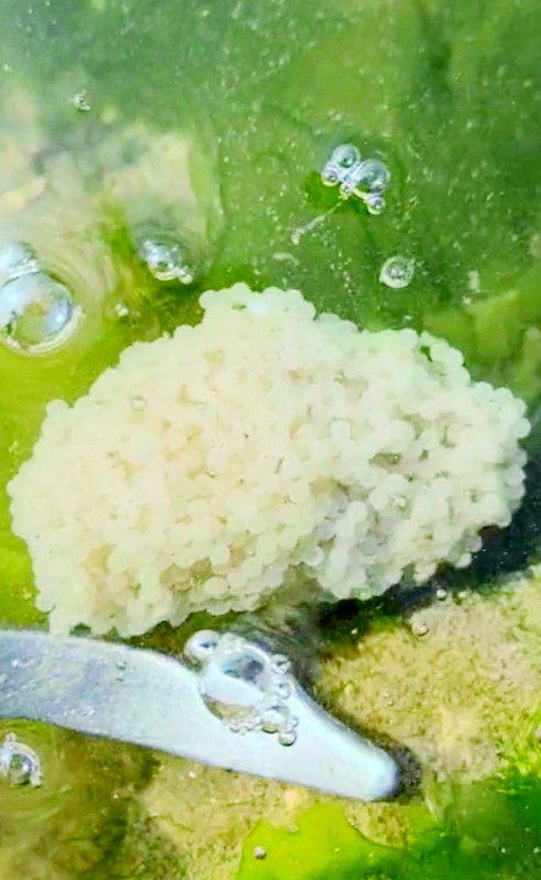 3月18日,记者联系到视频发布者廖女士。据廖女士描述,3月17日14时30分,退潮后她在海边游玩,突然发现海水中有一团团白色的物体在随波漂浮。走近细看,这些物体由数百粒白色卵紧密聚集而成,约有拳头大小。廖女士用手中的器物轻轻拨弄,发现这些卵团质地柔软,但卵粒之间黏附紧密,并未分散开来。她仔细数了数,视野范围内共有4个这样的白色卵团。