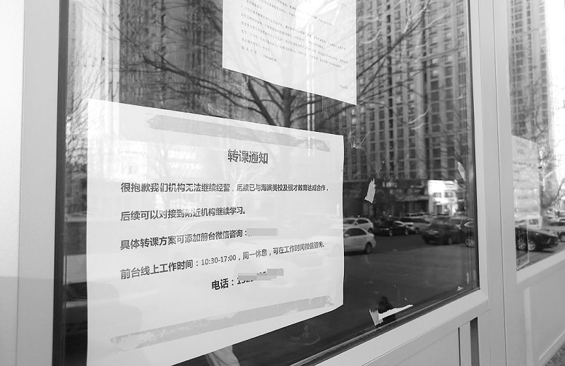 记者注意到,机构的玻璃门上张贴着三张通知。其中一张是转课通知,上面写明:“很抱歉,我们机构无法继续经营。后续已与海滨美校及骥才教育达成合作,学员可对接至附近机构继续学习。”