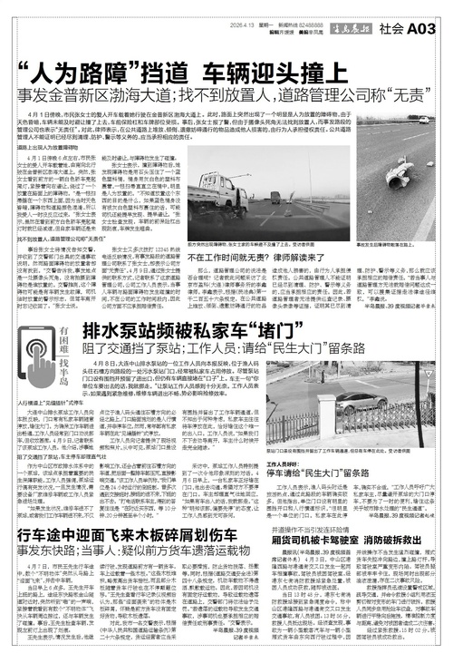“人为路障”挡道 车辆迎头撞上