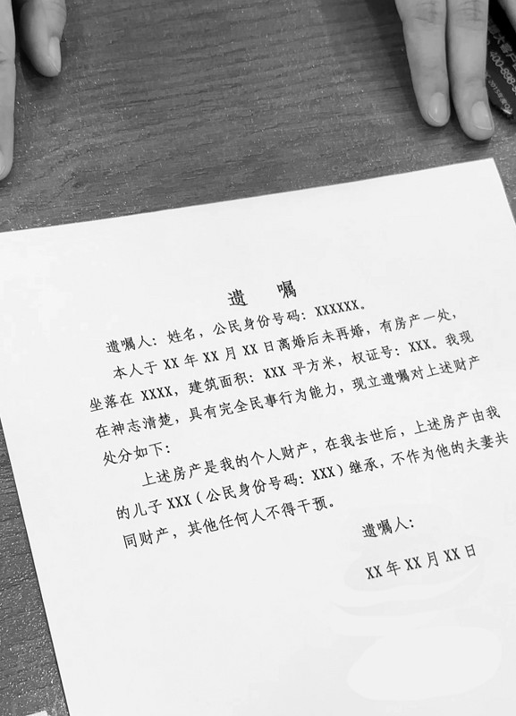 “我们日常工作中见到的手写遗嘱类型很多。”庄慧敏说,有的是几张纸条,有的是厚厚的一叠“家书”。无论行文风格如何、长短如何,遗嘱内容清晰、合法,才能最大限度保障遗愿的完成。庄慧敏拟定了一份公证遗嘱的示范样本以供参考。