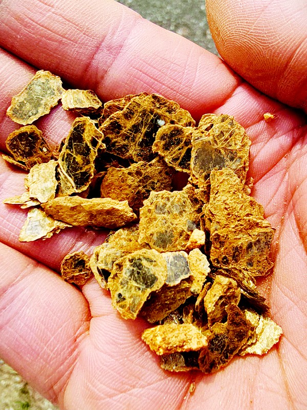 为了满足孩子的探索欲,父子俩在不破坏地表的情况下,沿着山脉仔细搜寻,还捡到几块闪着光芒的岩石。借助网络查询再次识别,那些亮片正是云母。孙先生发现,这些岩石中夹杂着云母片,而周围五公里范围内,几乎长满了问荆草。